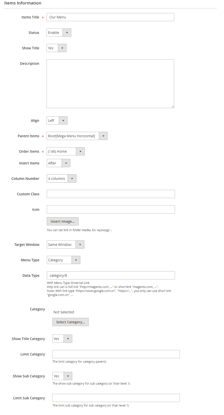 Select Mega Menu: Allow to choose Mega Menu.