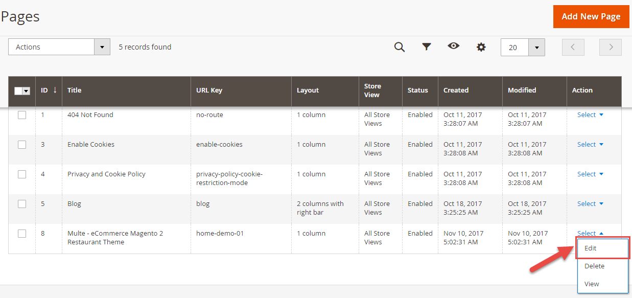 From the top menu, please select Content >> Elements >> Pages. Here you can find all the store pages that you have imported, so you don't need to add them. You only need to update the pages HTML and XML content as you wish.