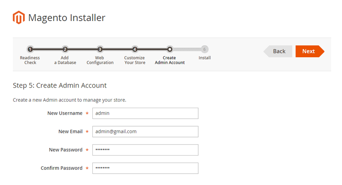 - Step 10: You need to Create Admin Account. Enter your information and move to the next step.