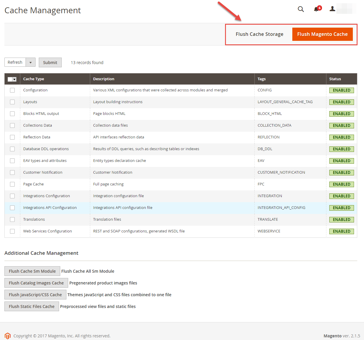 4. Flush Cache: After successfully import your demo, save Theme Settings and Design Settings and clear the cache by using this command as php bin/magento cache:flush in Command Prompt. Or you could go to System >> Tools >> Cache Management, click 'Flush Cache Storage' button to flush all the cache.