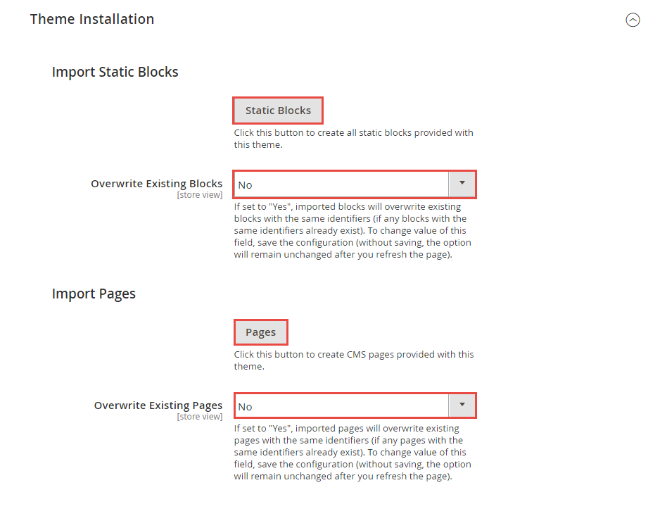 1. Press the buttons named 'Static CMS Blocks' and 'Pages' to import all default blocks and pages.