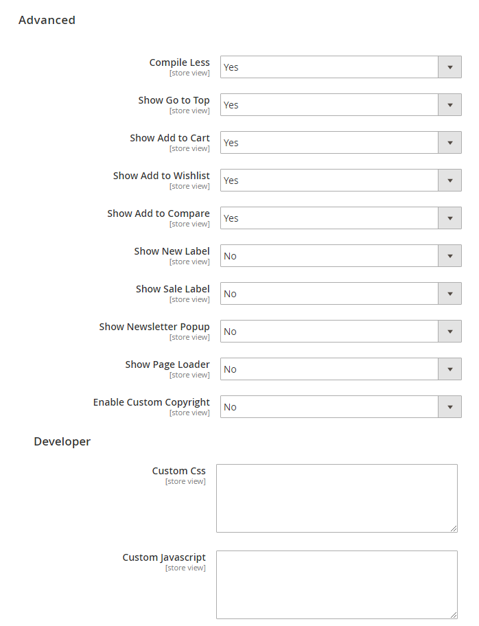 Choose "Yes/No" to "Show/Hide" Go to Top, Add to Cart, Add to Wishlist, Add to Compare, Newsletter Popup, Copyright, etc.